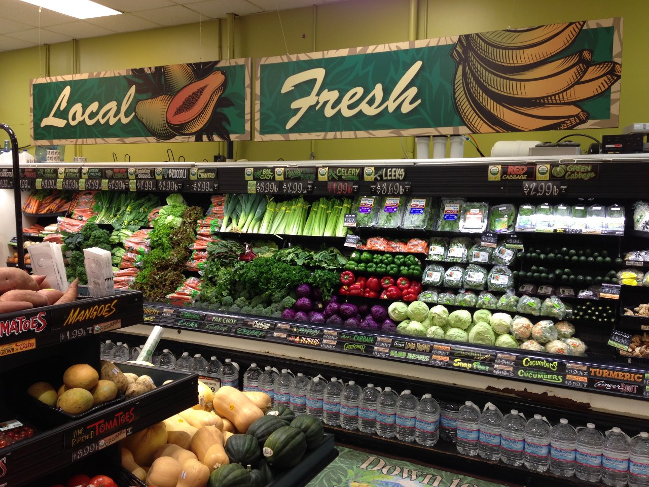 中に入ると入口周辺にはローカルと書かれた野菜コーナーをはじめ新鮮な野菜や果物が並びます。